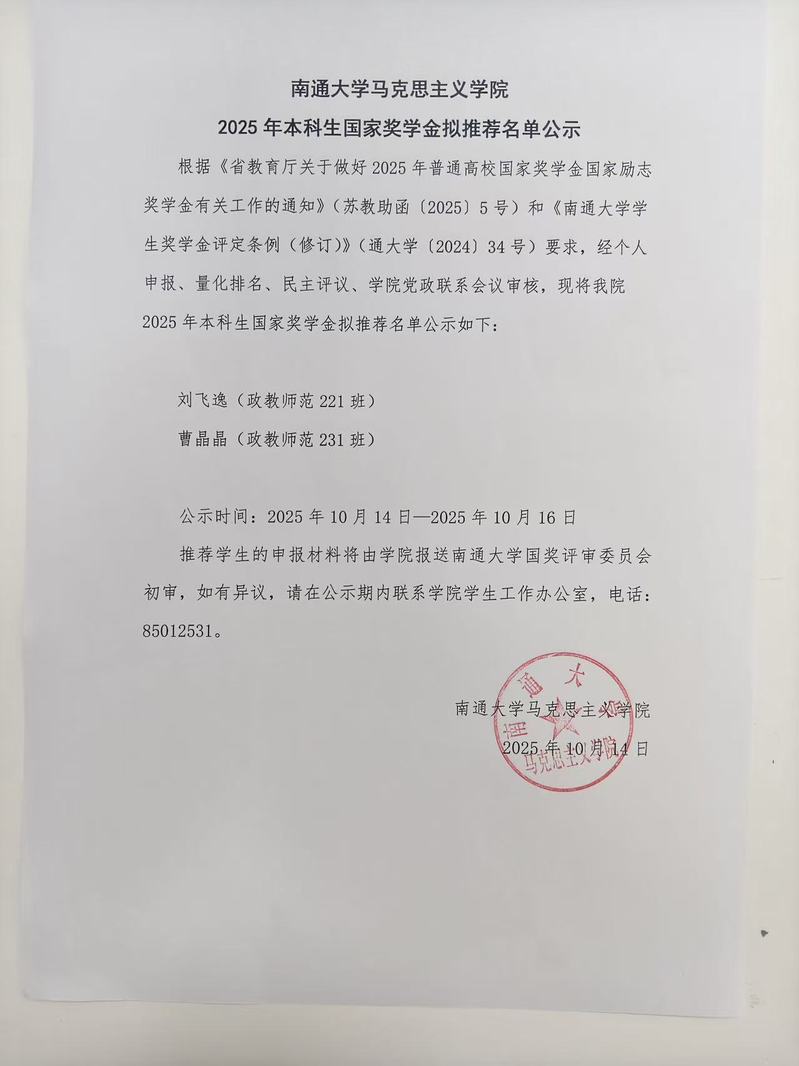 南通大学学院2025年本科生国家奖学金拟推荐名单公示