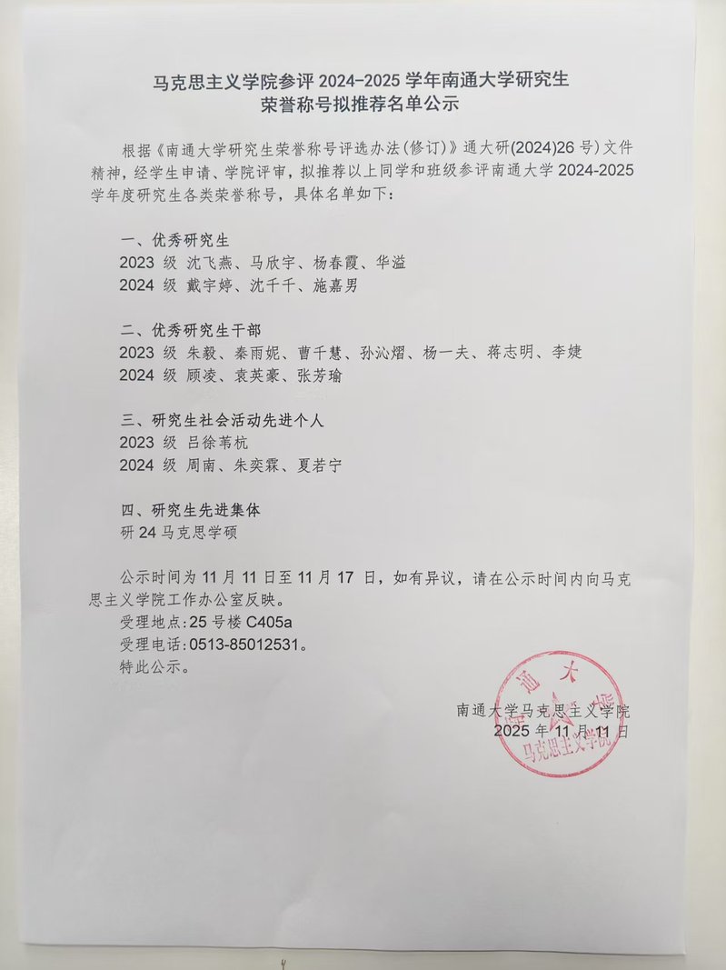 新威尼斯v0008参评2024-2025学年南通大学研究生荣誉称号拟推荐名单公示